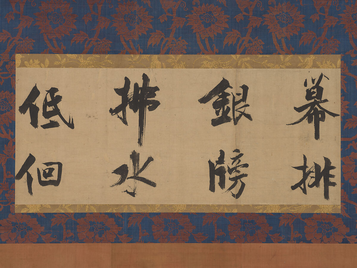 Zhang Jizhi, the last important calligrapher of the Song period, was a devout Buddhist who often transcribed religious texts as an act of devotion. He obtained his jinshi degree, the highest rank in the civil service examination, but never rose to high office. As a calligrapher, however, his fame spread beyond the borders of the Song to the Jin empire in northern China as well as to Japan, where his handwriting was particularly prized by Zen monks. Zhang was noted for his forceful large-character standard script, with its boldly contrasting blunt and sinuous brushstrokes. This piece, remounted centuries ago in Japan for display in a tokonoma, was cut from a long handscroll transcribing a poem by Du Fu (712–770) in such a manner that the poetic phrasing of the original is completely fragmented. The original two couplets may be translated as follows (the text of this scroll is on the fourth and fifth lines):
