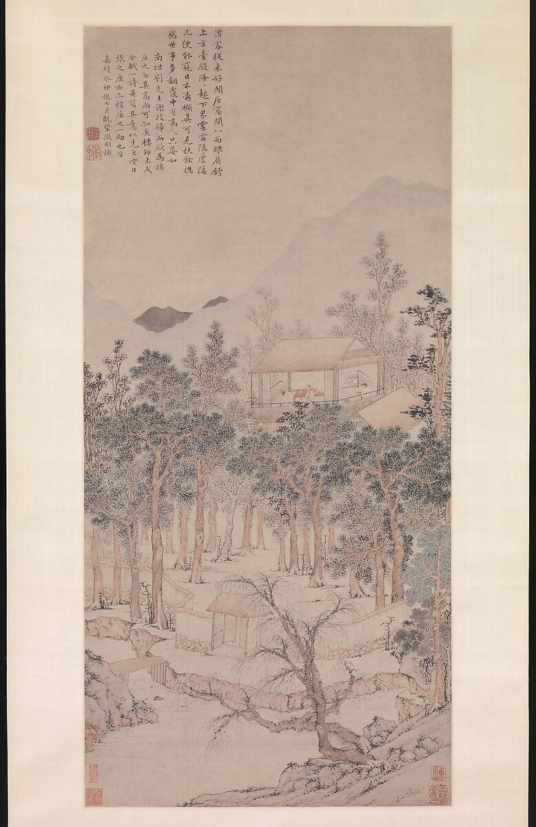 Wen Zhengming painted Living Aloft for his friend Liu Lin (1474–1561), who, at the age of seventy, had retired from government service but had not yet built a home suitable for his new life. Wen's painting presents an idealized vision of life in retirement: separated from the outside world by a stream and a rustic wall, two friends enjoy each other's company in a two-story hall that is further isolated in a tall grove of trees. Wen elaborates on the pleasures of such a life in his accompanying poem: