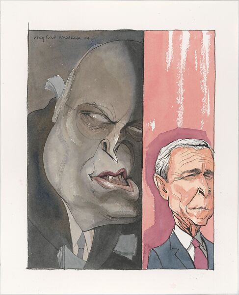 A seething Vice President Cheney, his face distorted by nefariousness, looms over President George Bush and whispers to him from behind a curtain. Woldhek contrasts a menacing Cheney, set in shadow, his eyes peering out of his head as though possessed by malevolence, with a seemingly innocuous, hardly caricatured Bush, who stands before a brightly lit pink curtain. Woldhek, a prominent Dutch caricaturist, plays upon the broadly held image of Cheney as the manipulator behind the Bush administration's most controversial policies. The caricature was originally created for the Dutch newspaper the NRC Handelsblad during the election campaign for Bush's second term; the artist revised the image in 2010.