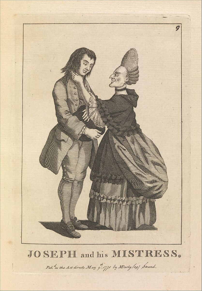 This image of a young man and his older lover comes from a set of twenty-four caricatures that Matthew and Mary Darly published in 1771. A husband-and-wife team, the Darlys developed a new British print genre--small etched caricatures of single figures against plain backgrounds, their identities indicated through dress, pose and a few props. Many of these works mocked the fashionable manners of contemporary London dandies called "macaronis," and the Darly's wares soon became known as macaroni prints no matter what their subjects. The implied Italian connection was in fact appropriate, since the basic form was inspired by Ghezzi's caricature drawings brought back from Rome by Grand Tourists. The form and subjects adapted by the Darlys tickled British tastes and broadened the scope of Ghezzi's works to include a range of social classes, known figures, and types.