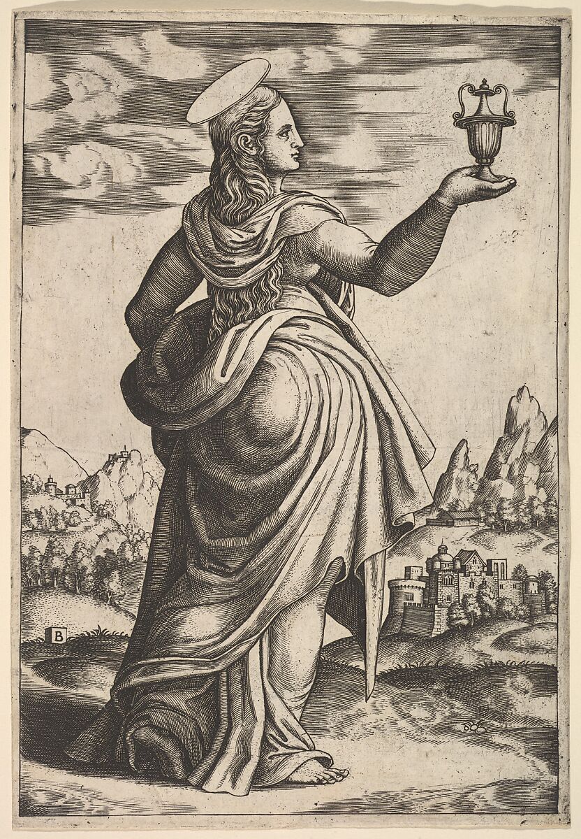 - Title: The Magdalene standing facing right, jar held in her raised right hand