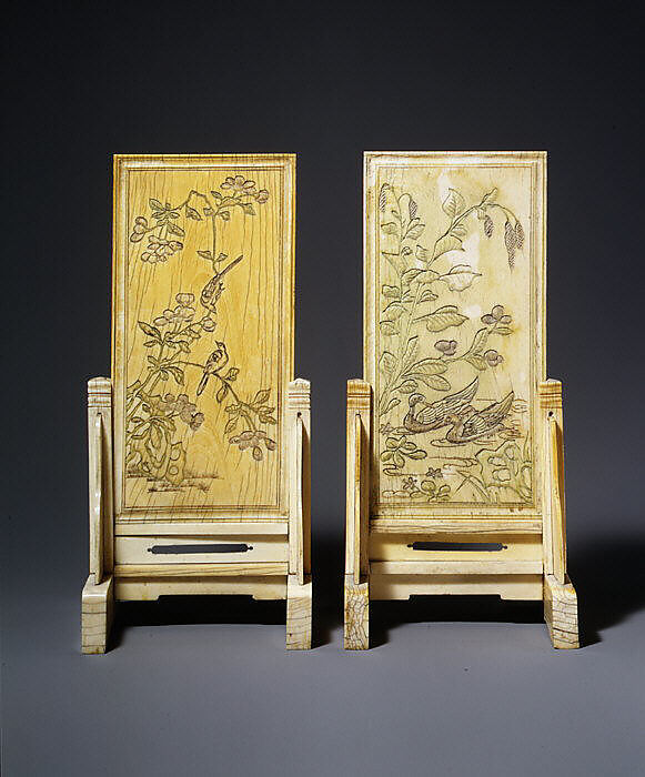 Ducks and water plants are incised into one of this pair of screens; small birds perched on plum blossoms adorn the other. Both images are inspired by poems engraved on the backs of the screens. One, by Zhu Xi (1130–1200), describes the tranquil sound of the swimming ducks. The other, by an unidentified poet, refers to the opening of the petals of a tea plum.