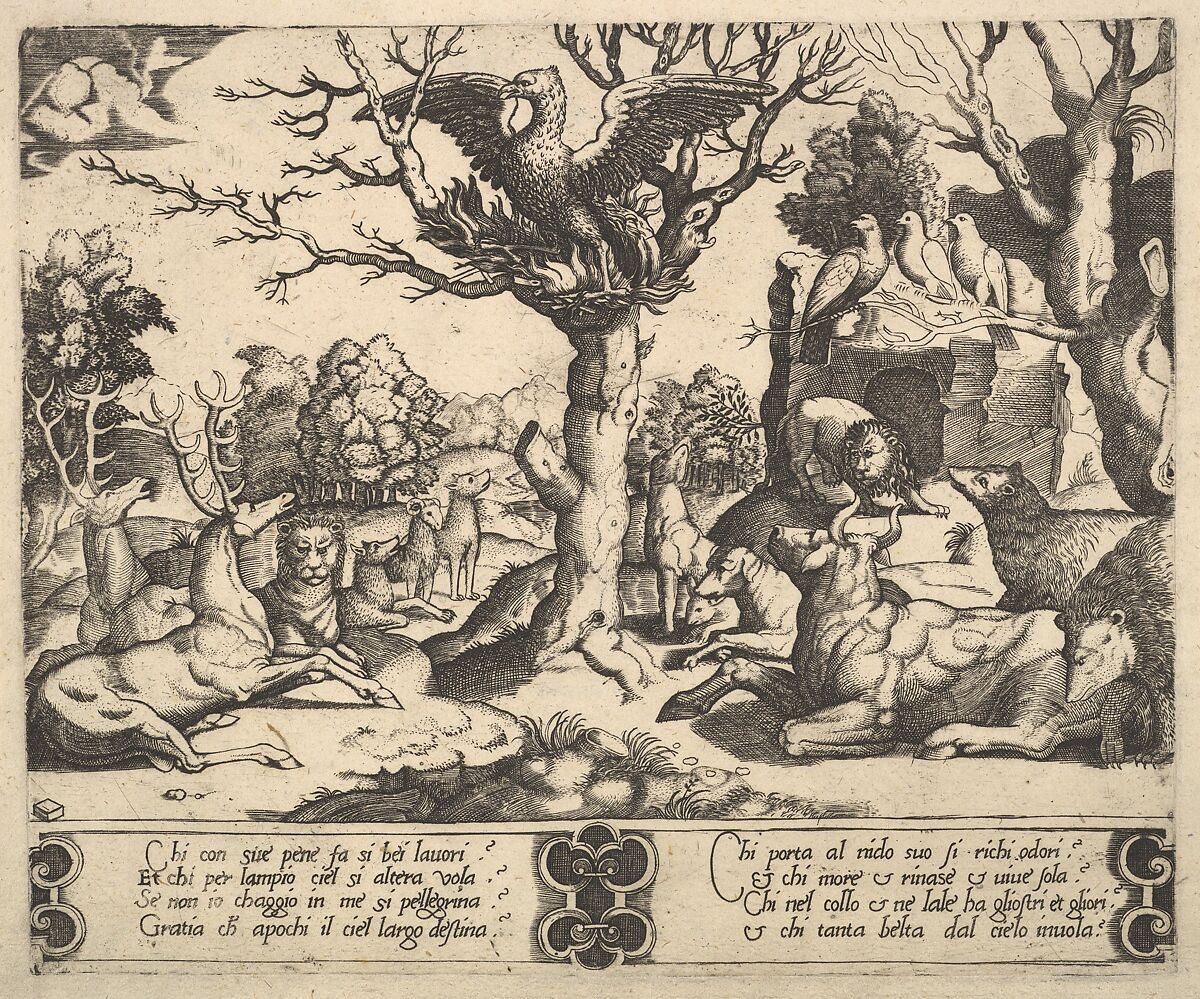 - Title: A phoenix sat atop a tree, wings open, an assortment of animals below