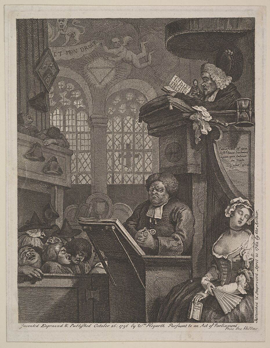 A congregation dozes during a church service as the clergyman reads from the gospel and his clerk, sitting below the pulpit, eyes the exposed bosom of a young woman. The preacher was intended by Hogarth to satirize his contemporary John Theophilus Desaguliers. Originally published in October 1736, Hogarth here republished the print in 1762, adding elements such as two warts on the reader's face and cracks in the wall on which the angel is painted.
