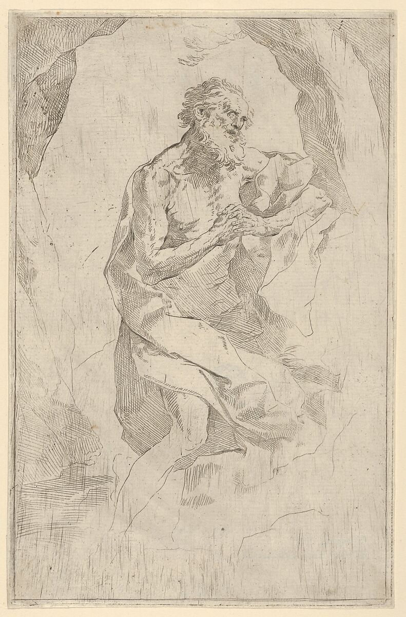 - Title: Saint Jerome kneeling on a rock facing right