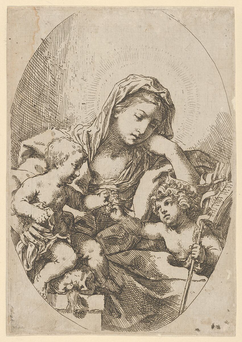 • Title: The Virgin with the Christ Child and the young Saint John the Baptist holding a bird at right, an oval composition, after Reni