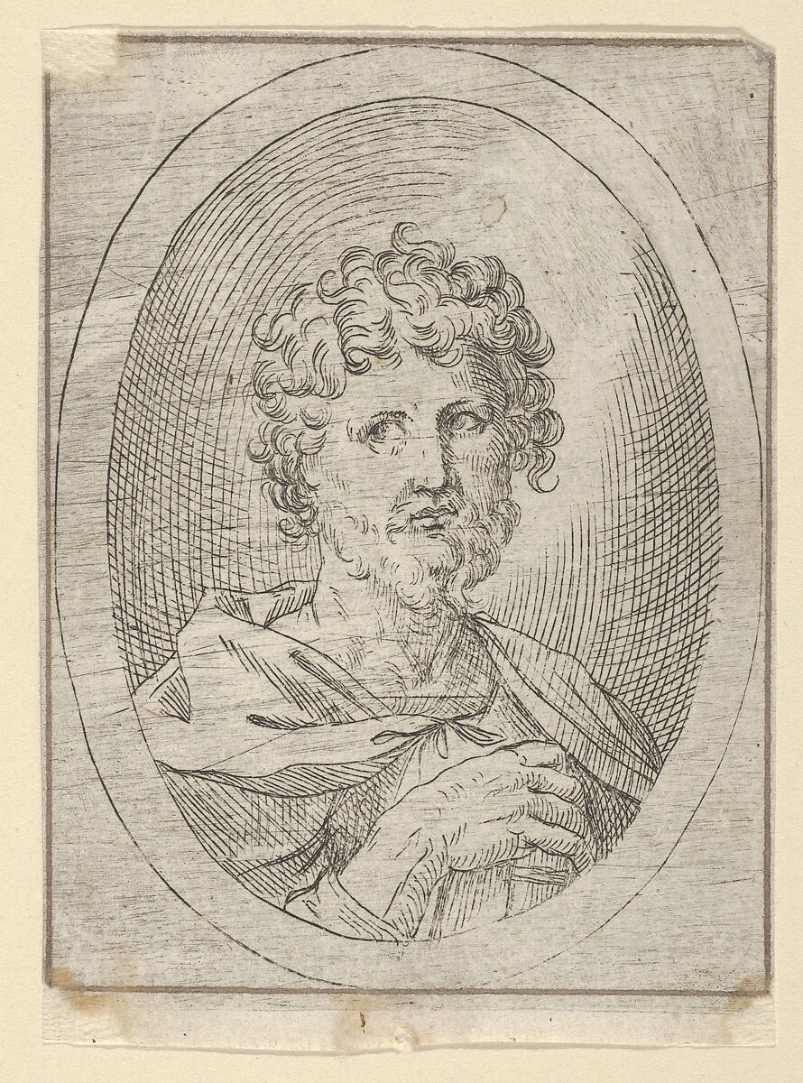 - Title: An apostle holding a closed book and looking to the left, in an oval frame, from "Christ, the Virgin, and Thirteen Apostles"