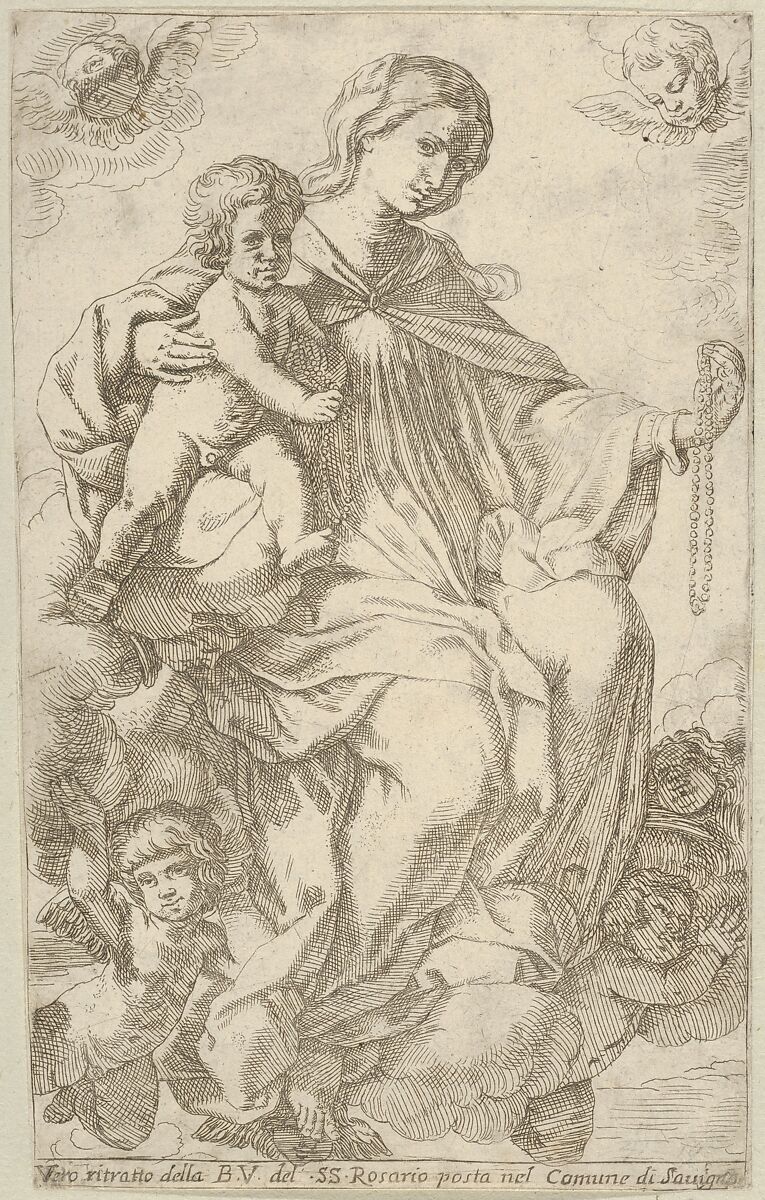 - Title: The Virgin in the clouds holding a rosary in her left hand and embracing the infant Christ, who also holds a rosary, angels surrounding them