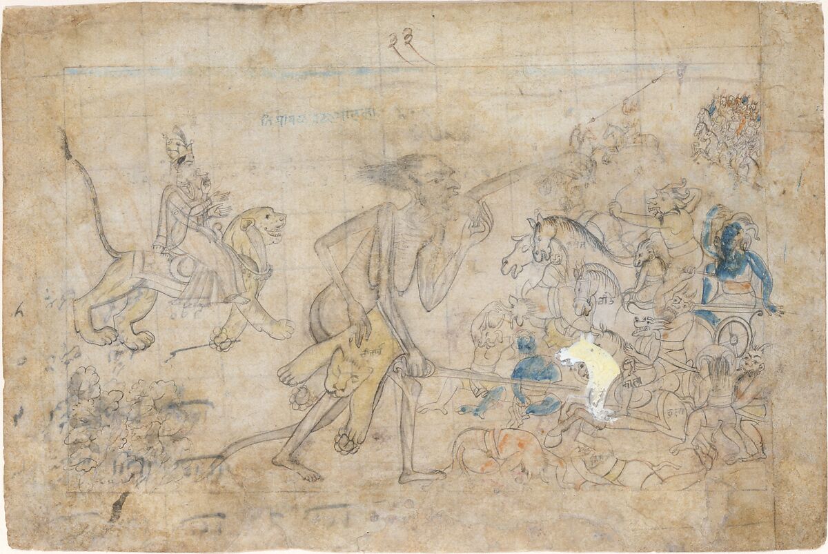 The second great battle in the Devi Mahatmya occurs when Durga tells the terrible demon Shumbha that she will only marry a man who defeats her in battle. He responds by sending the demons Chanda and Munda and their armies to drag her back by her hair for her insolence. After Durga manifests Kali from her brow, the two enter the battle. This work directly corresponds to the text, which describes Kali, looking gruesome with emaciated skin, devouring elephants and riders by pulverizing them with her teeth. This preparatory sketch includes color notations and initial coloring. The page was overlaid with a grid, presumably to allow the image to be transferred or enlarged.