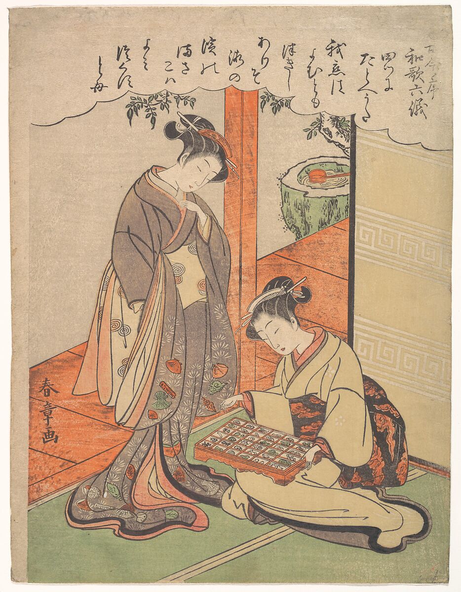 The beauty of Shunshō's print gathers further elegance from two layers of poetic devices—a visual allustion to the imagery in a poem describing a love "as infinite as the shells upon the shore" and the analogy itself, discussed at length in the preface to the Kokin waka shū. The passage from the preface is quoted in the cloud at the top of the print. The subtle play of meaning between the collecting of shells and the collecting of poetry—a box of shells becomes a visual metaphor for an anthology of poetry—is particularly pleasing.