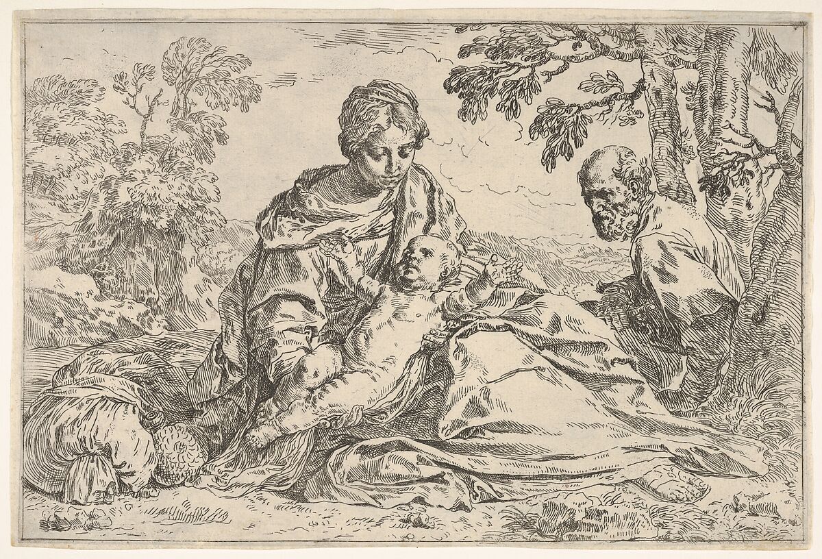 - Title: Rest on the flight into Egypt, Mary holding the infant Christ with St. Joseph at right, copy after Cantarini