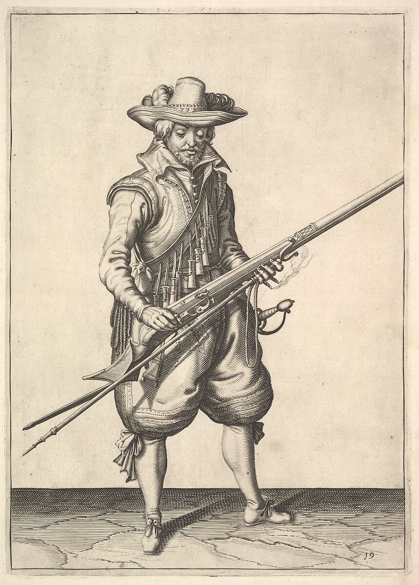 - Title:A soldier shaking the powder from the top of the pan, from the Musketeers series, plate 19, in "Wapenhandelinghe van Roers Musquetten Ende Spiessen" (The Exercise of Arms)
