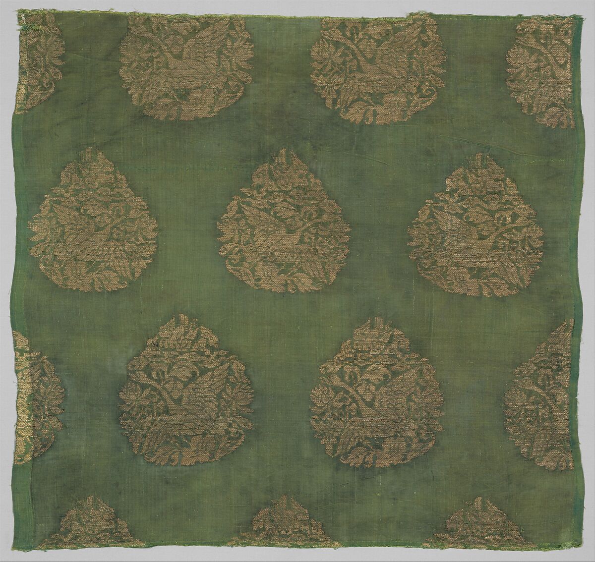 Hunting swans with a falcon was an important annual autumnal event for nomadic people such as the Jurchen rulers of the Jin dynasty, one of several rulers who controlled much of northern China from the tenth to the fourteenth century. Illustrations of this important seasonal event are found in textiles, jade, and ceramics. Historical texts record that Jurchen noblemen wore green silk robes with this motif during hunts. This piece is perhaps a fragment from such a robe.
