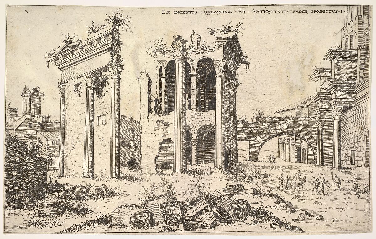 - Title: View of unidentified ruins with trabeated facade at left, arcades at center, and arch at right, from "The Roman Ruins" (Praecipua aliquot Romanae antiquitatis ruinarum monimenta, vivis prospectibus)