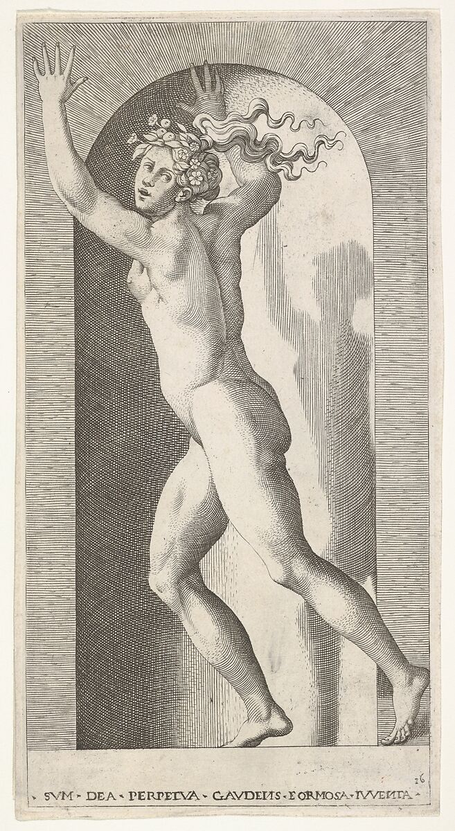 Plate 16: Hebe in a niche with her hands in the air, running to the left while looking to the right, from a series of mythological gods and goddesses