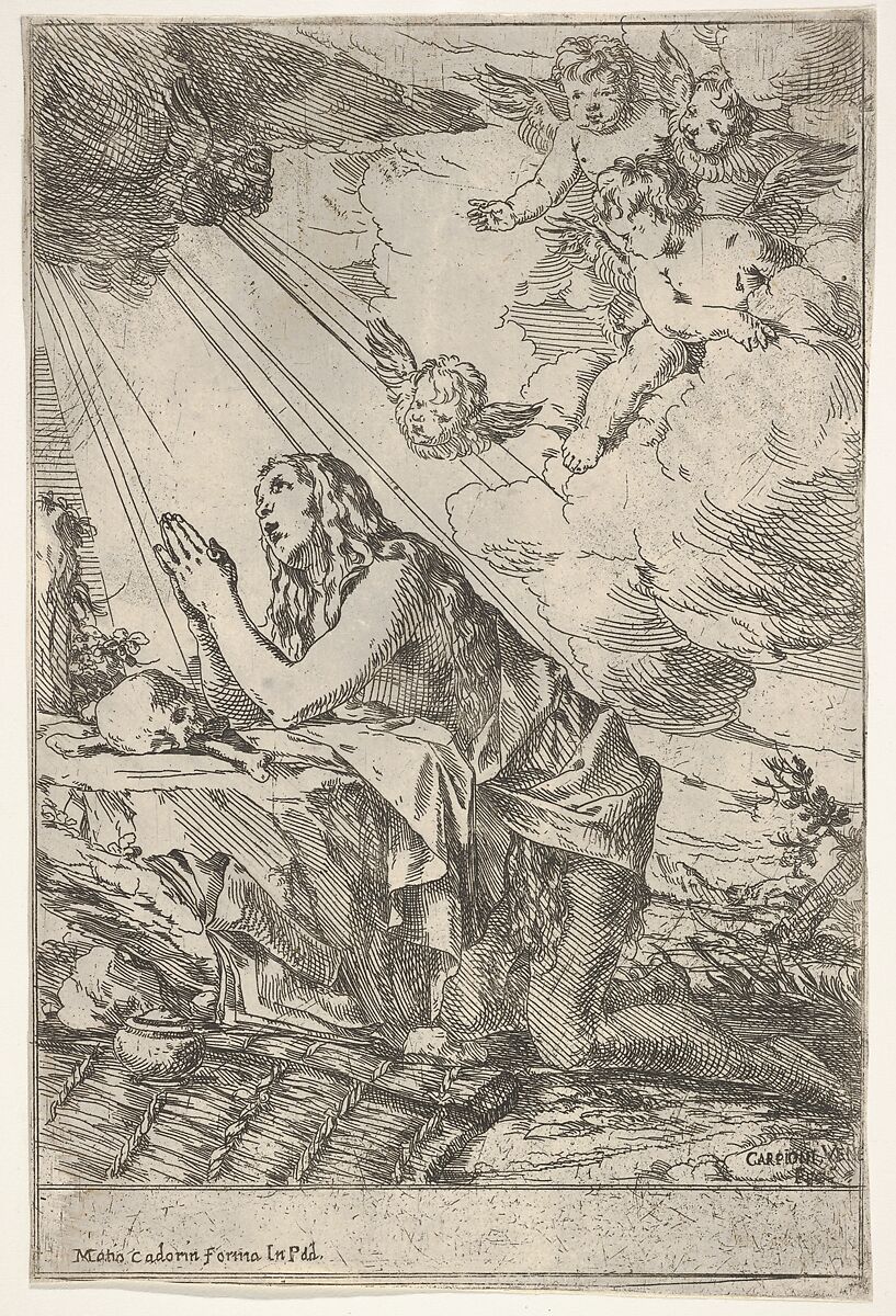 - Title: Penitent Magdalen kneeling on a rocky ground before a skull and bones, an ointment jar lies in the left foreground, rays of light and winged putti descend from above