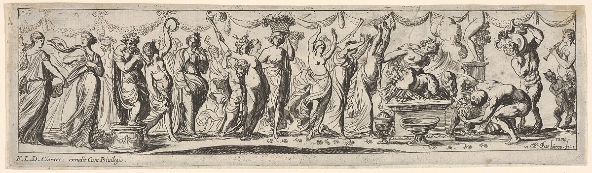 - Title:Procession of draped female dancers, women bearing baskets, and male musicians, at right a satyr lies bound on a pyre, from a series of twelve frieze-like designs showing bacchanals, sacrifices, and dances