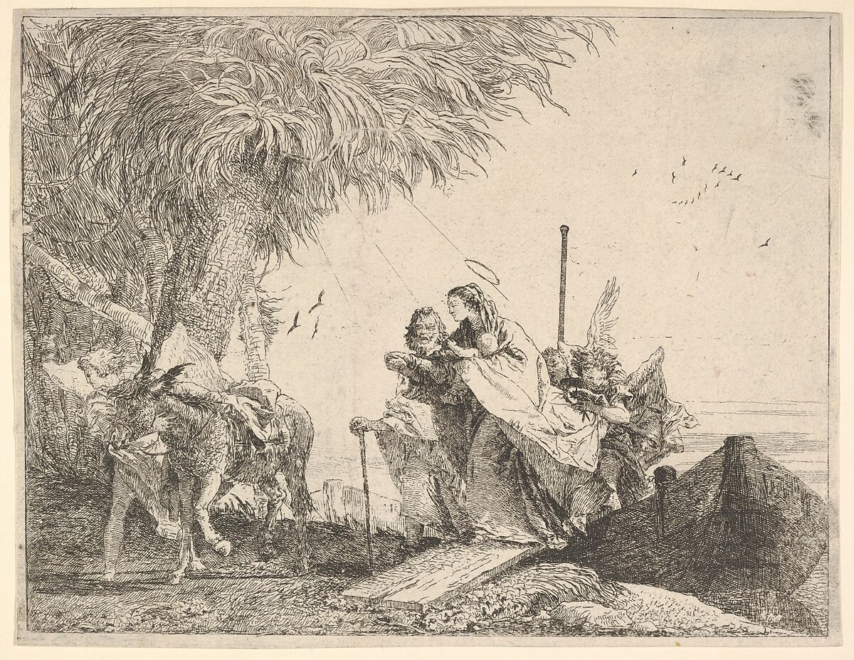 - Title: Mary, helped by Joseph and an angel, stepping from a boat to the shore, an angel steadies a donkey before her, from "The Flight into Egypt"