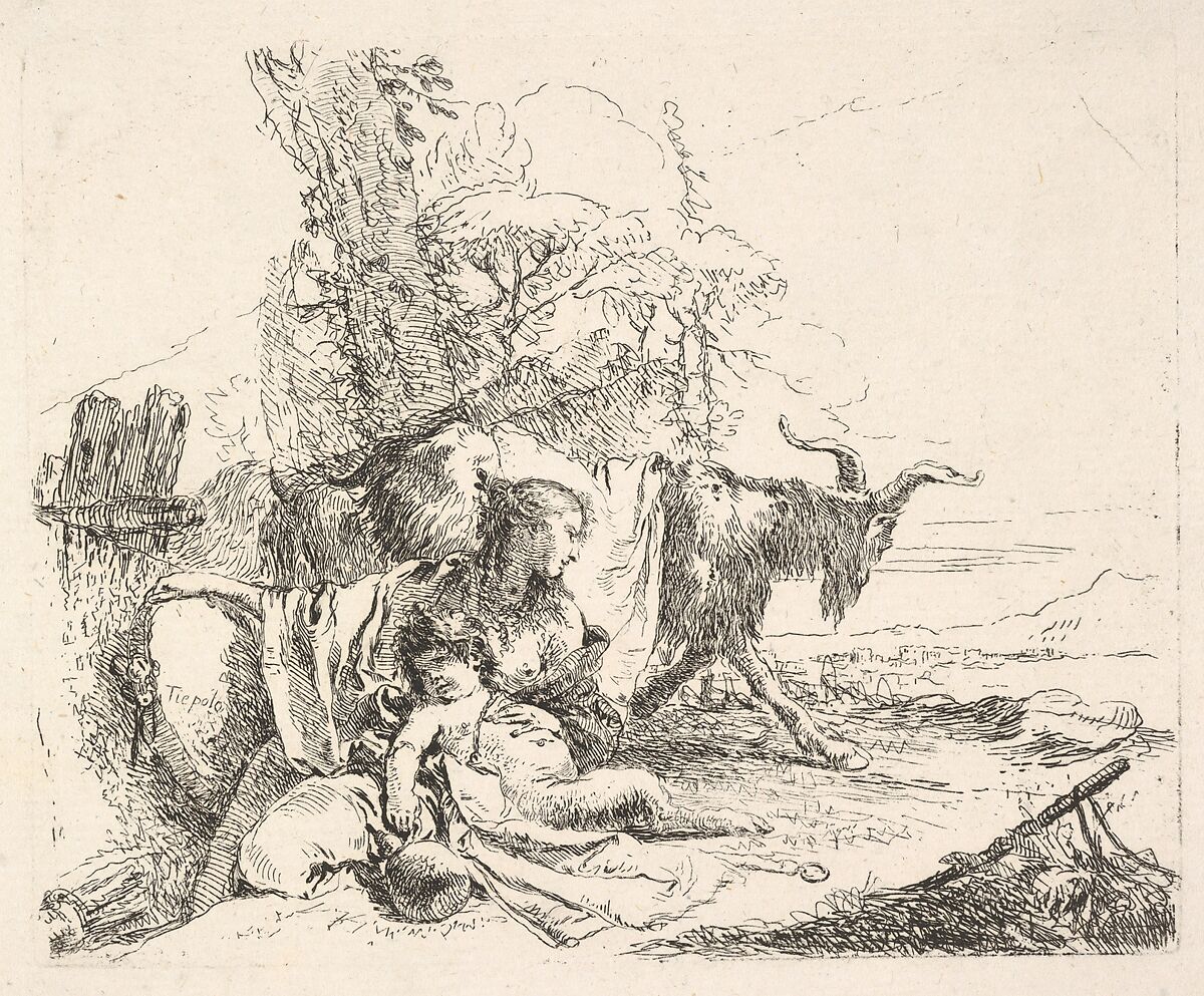 - Title:Woman and infant satyr in a landscape, the woman twisting to look over her left shoulder, a horned goat striding toward the background, from "The Capricci"