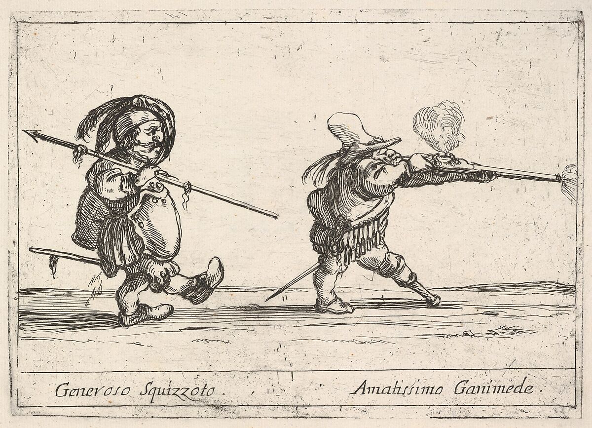 - Title: Callot figures; a dwarf man with a spear at left walking towards the right, another dwarf man with a pegleg firing a musket at right, from "Six grotesques" (Six pièces de figures grotesques)