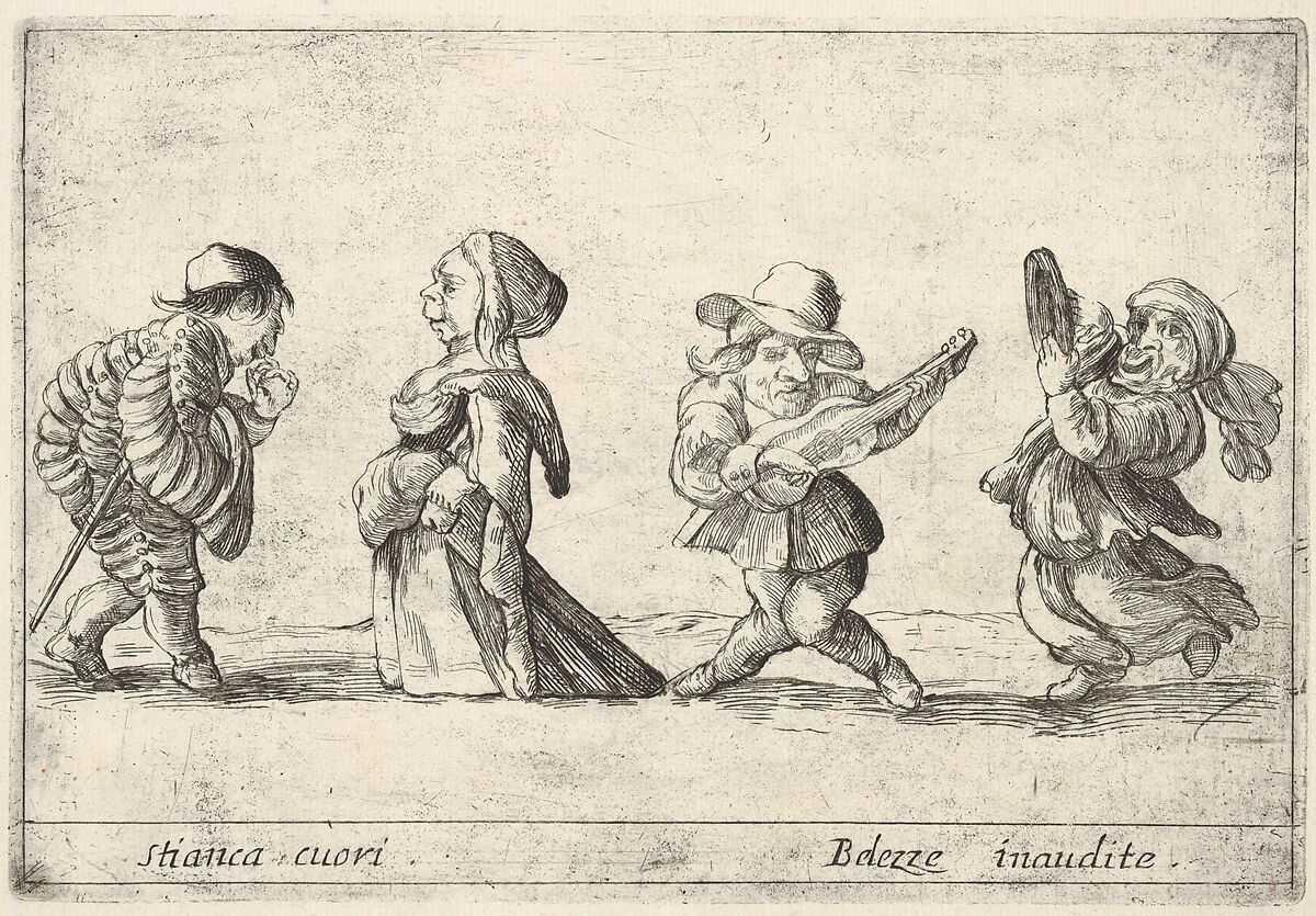 - Title: Callot figures; a well-dressed dwarf man to left declaring his love to an old dwarf woman to left, a dwarf man playing the guitar and a dwarf woman dancing with a tambourine to right, from Six grotesques (Six pièces de figures grotesques)