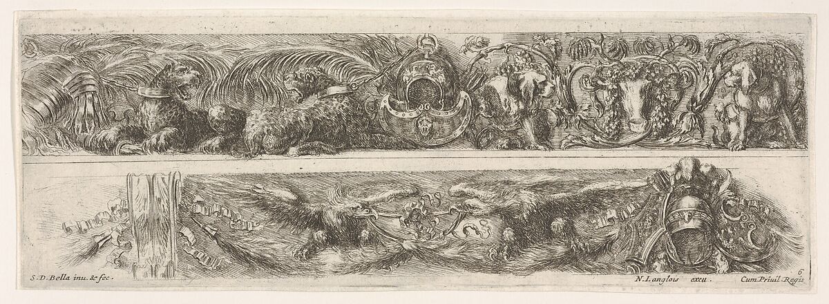 - Title: Two Designs for Friezes or Consoles characterized by Armorial Trophies, plate 6 from "Decorative friezes and foliage" (Ornamenti di fregi e fogliami)