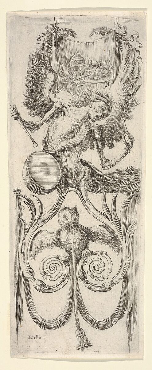 - Title:Death beating a drum above, an owl and a bell attached to a ribbon below, from "Ornaments or Grotesques" (Ornamenti o Grottesche)