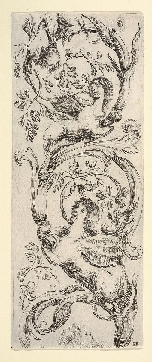 - Title:Three sphinxes climbing a vine, from "Ornaments or Grotesques" (Ornamenti o Grottesche)