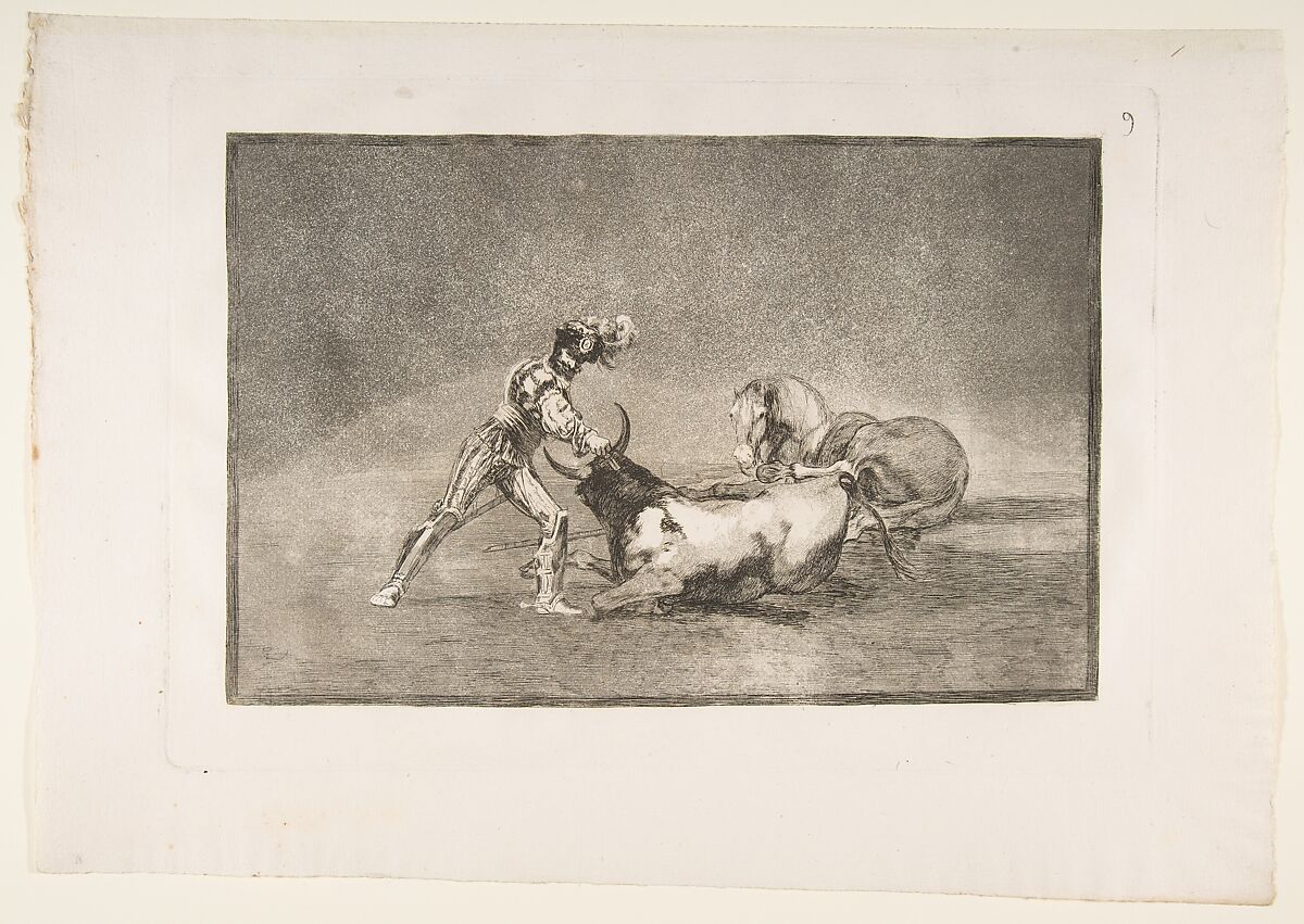 - Title: Plate 9 from "La Tauromaquia": A Spanish knight kills the bull after having lost his horse