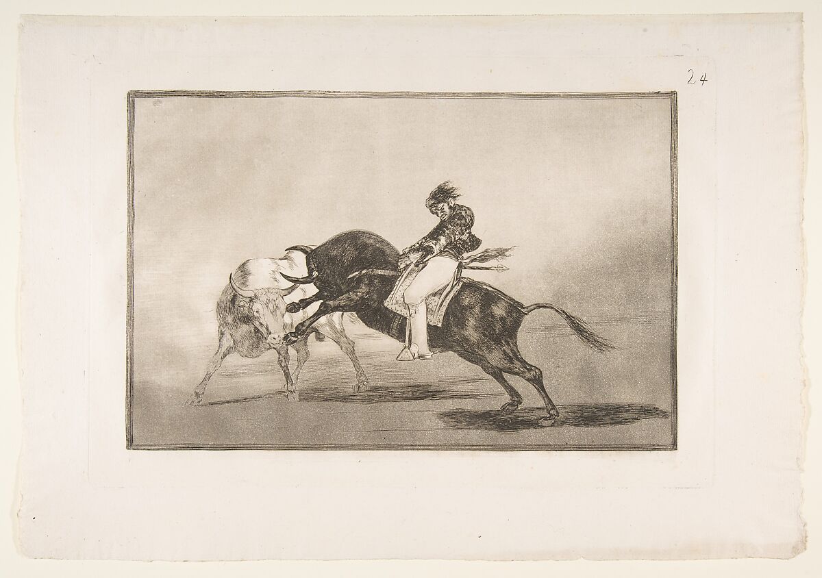 - Title: Plate 24 of "La Tauromaquia": The same Ceballos mounted on another bull breaks short spears in the ring at Madrid
