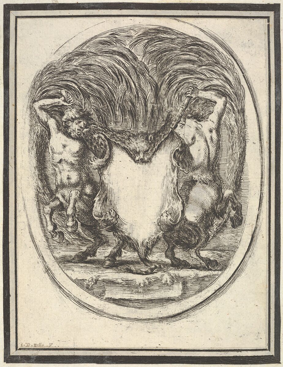 - Title:A cartouche formed by a tiger skin and flanked by two centaurs, plate 4 from "Nouvelles inventions de Cartouches"