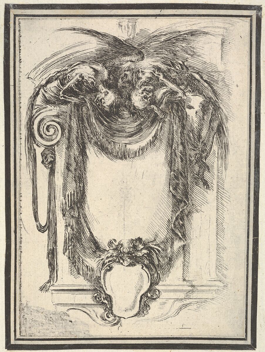 A cartouche formed by drapery and topped with two skeletons atop an Ionic entablature, plate 10 from "Nouvelles inventions de Cartouches"