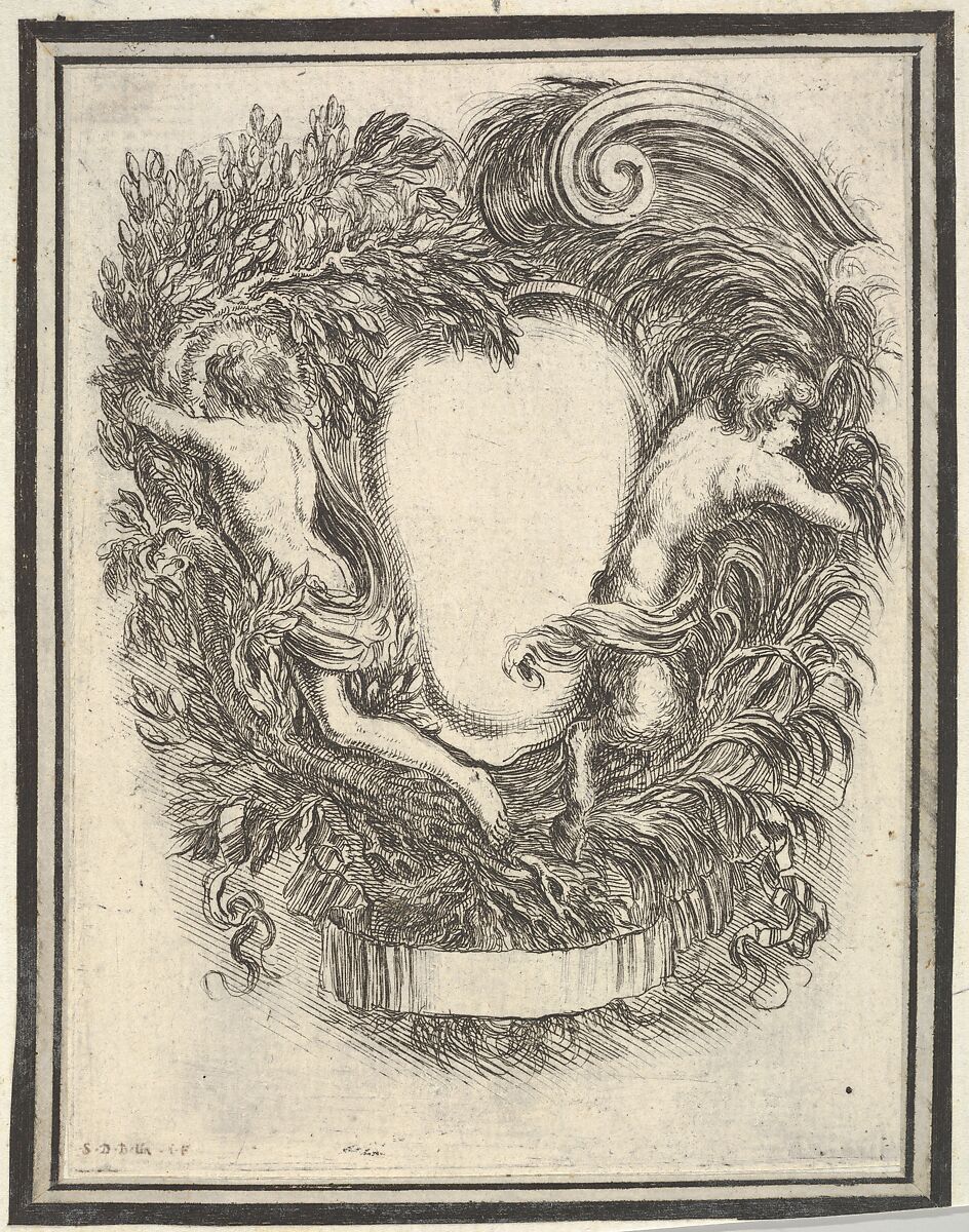 A cartouche flanked by Apollo and Pan, plate 5 from "Nouvelles inventions de Cartouches"
