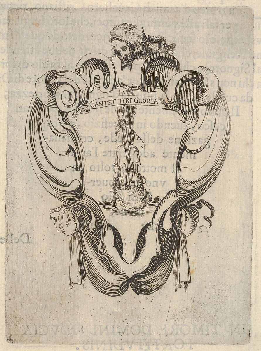 - Title:A cartouche with a violin coming out of its case, a skull with a helmet with feathers at top, from "Eight Emblems for the Funeral of Francesco de Medici" (Huit emblèmes pour les funérailles du prince François de Médicis)