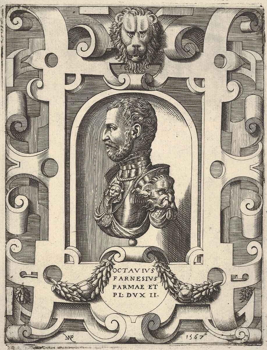 - Title: Bust portrait of Ottavio Farnese, shown in profile within a niche, surrounded by an ornamented cartouche