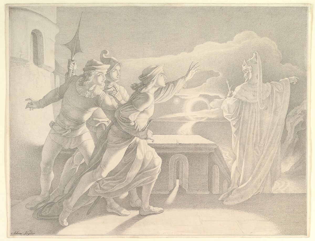 (act 1, scene 4), shows the prince encountering his father’s ghost outside Elsinore, the Danish royal castle. Restrained by his friend Horatio, Hamlet struggles to follow the spirit, who will later reveal that he was murdered and demand revenge. Vogler’s composition responds to a painting that the Swiss artist Henry Fuseli created in 1789 for John Boydell’s Shakespeare Gallery, which the younger artist would have known through prints (see 42.119.545). This finely drawn variation emphasizes the mysterious moonlit atmosphere and adds accurately detailed Renaissance costumes, a strategy in keeping with the historical Romanticism that Vogler learned at the Viennese Academy from the Nazarene painter Joseph von Führich.