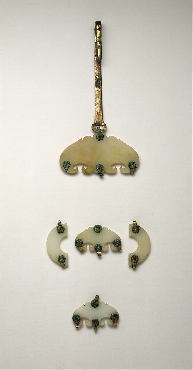 This reconstruction of a composite jade pendant represents a type originally suspended from a woman’s belt, as confirmed by depictions in Tang murals and stone engravings.