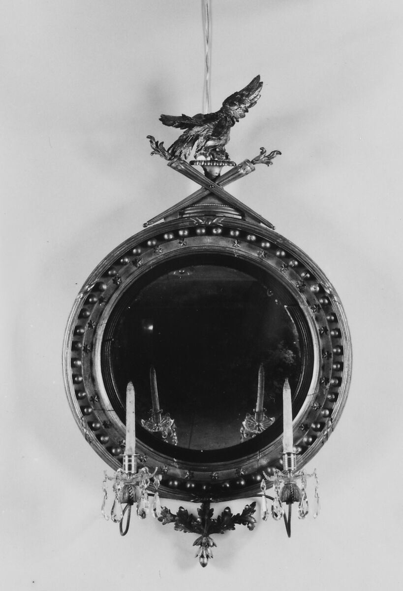 A round gilded frame with convex glass such as this is often referred to as a girandole, or girandole mirror. The convex shape of the silvered glass, the gilded surface, and the cut glass of the branches combine to increase the throw of light from the candles.