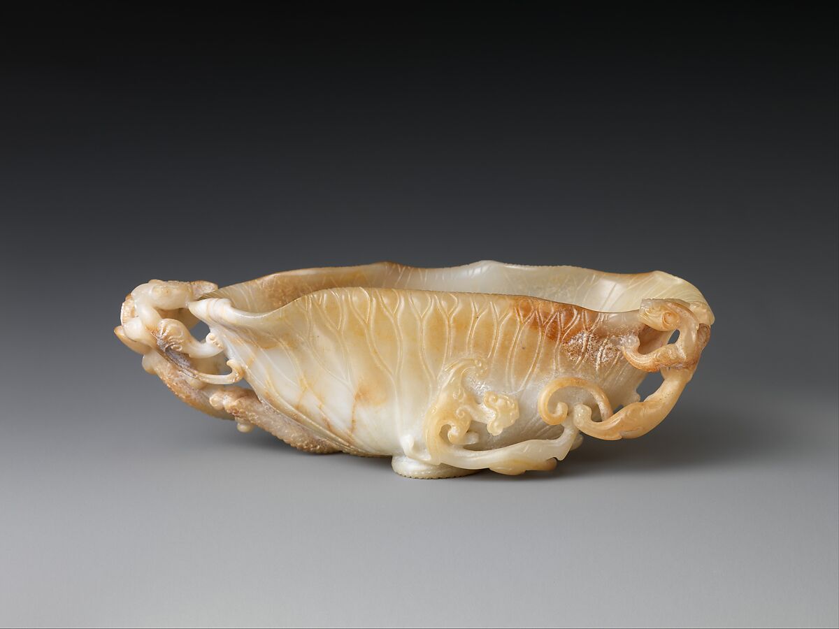 Two dragons with felinelike heads, known as chi, decorate the ends of this brush washer, which is carved from an opaque piece of white nephrite. Brown and yellow inclusions give the work an aged appearance. Historical records indicate that variegated jade was highly valued from the twelfth to the fourteenth century.