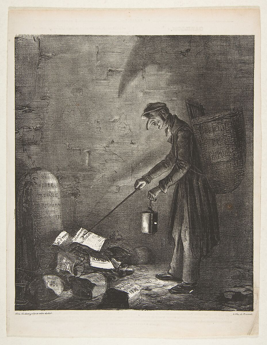 - Title: Masked Man using a Lantern to Collect Discarded Pamphlets by a Tombstone, from "Le Charivari"