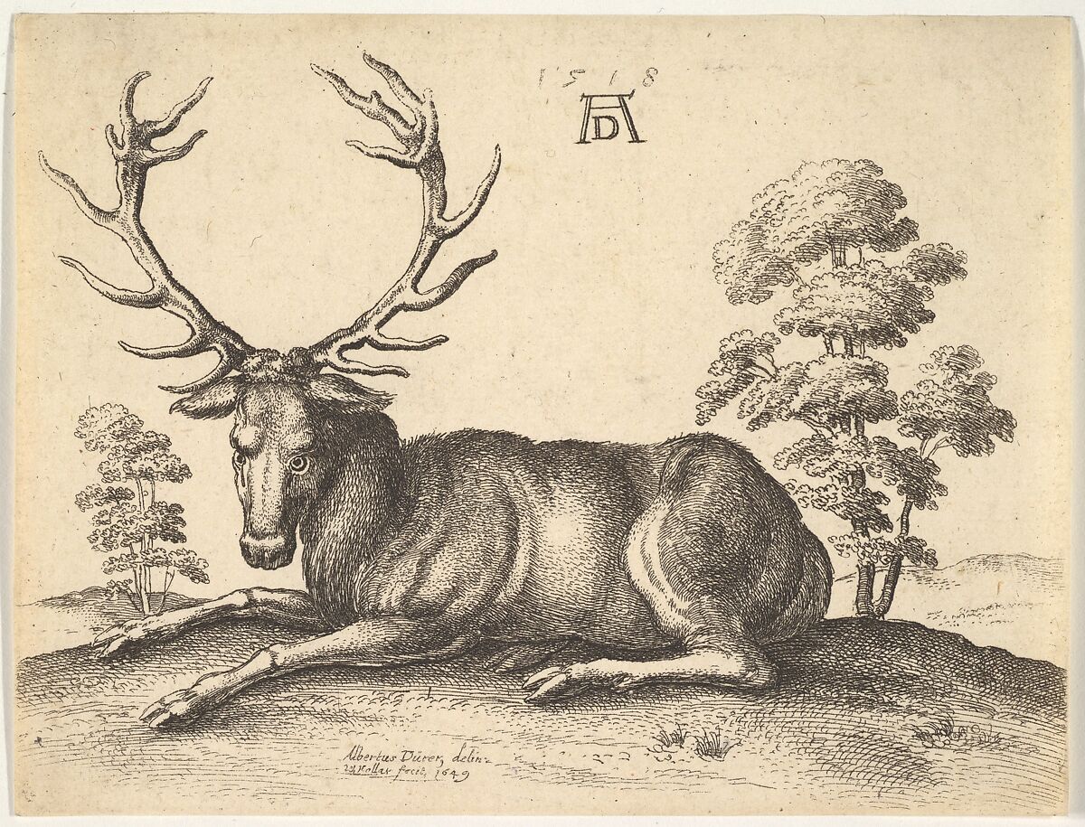 Stag lying to left, its head turned to front; two trees and hill in the background with Dürer's monogram above; after Dürer (?)