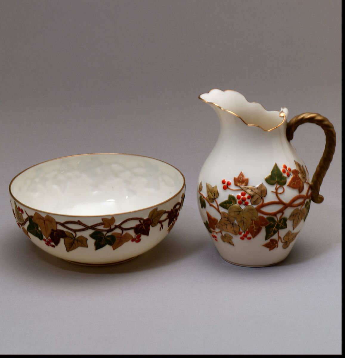 The relief design of ivy vines and berries on this cream pitcher is characteristic of Ott and Brewer’s earliest decorative approach to Belleek. In addition to shell-inspired dishes, the firm produced a number of wares featuring designs of delicate grasses, vines, or berries finely painted in greens, golds, reds, and black. This cream pitcher and its matching bowl are excellent examples of early American Belleek.