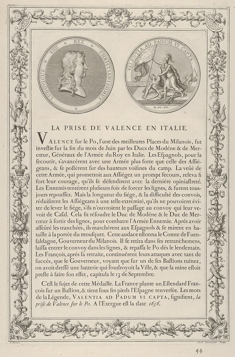This print reproduces the front and back of a medal struck to commemorate a French victory over the Spanish during a battle fought in the Po Valley near Milan in 1656. Various versions of this medal exist, all designed by the medalist Jean Mauger. The front of the medal contains a portrait en profil of the young King Louis XIV, while the verso shows the figure of Minerva overpowering a female figure, likely the personification of the conquered city. The images of the medal are struck from a different smaller plate, set within a larger composition that also contains a historic description of the battle. The text and images are presented in a frame decorated with armorial trophies and the monogram and coat of arms of the French king.