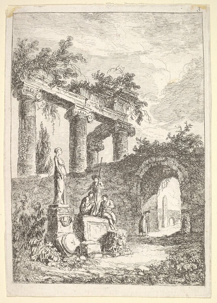 - Title:Plate 3: The Statue Before the Ruins: a statue to left next to three figures on a pedestal, a beggar standing in an archway to right, four columns and the remains of an entablature to top left, from "Les soirées de Rome"