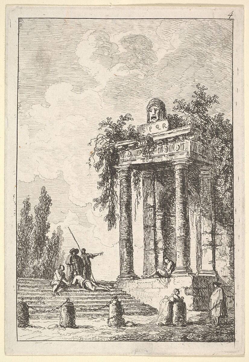 - Title: Plate 4: remains of a classical monument to right surmounted by a mask and tablet, a figure sitting on the porch, four figures on a staircase to left, four milestones below, from "Les soirées de Rome"