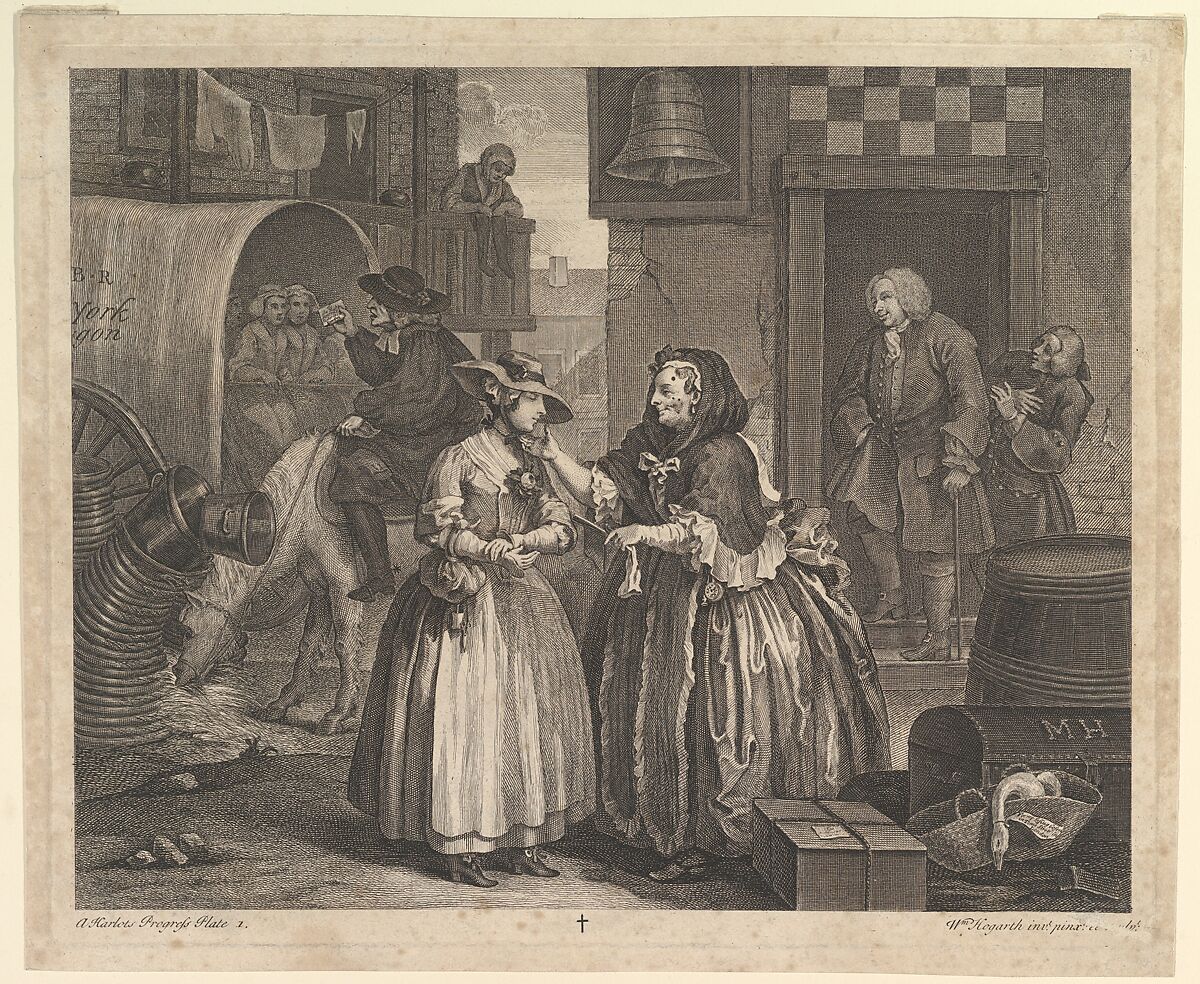 Set outside the Bell Inn, London. Mary Hackabout, a country girl, has just arrived on the York Wagon and is examined by an extravagantly dressed bawd Mother Needham. Behind them a clergyman on horseback fails to notice the encounter but a lecherous old gentleman (Colonel Charteris) eyes the girl with anticipation.