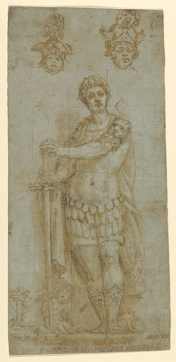 - Title: Figure in Roman Dress (Publius Cornelius Scipio Africanus) and Study of Two Helmets (recto); Sketches and Latin Inscription (verso)