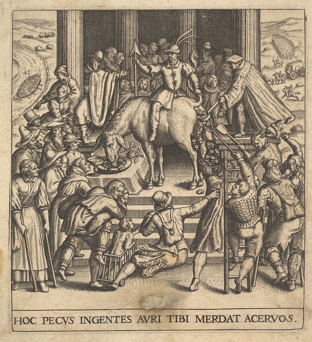 Men collecting dung dropping from the hindquarters of a mule, with a rider sitting backward on the mule and holding its tail aside, surrounded by onlookers spread around a stepped platform, from "Secular Emblems" (Emblemata Saecularia)