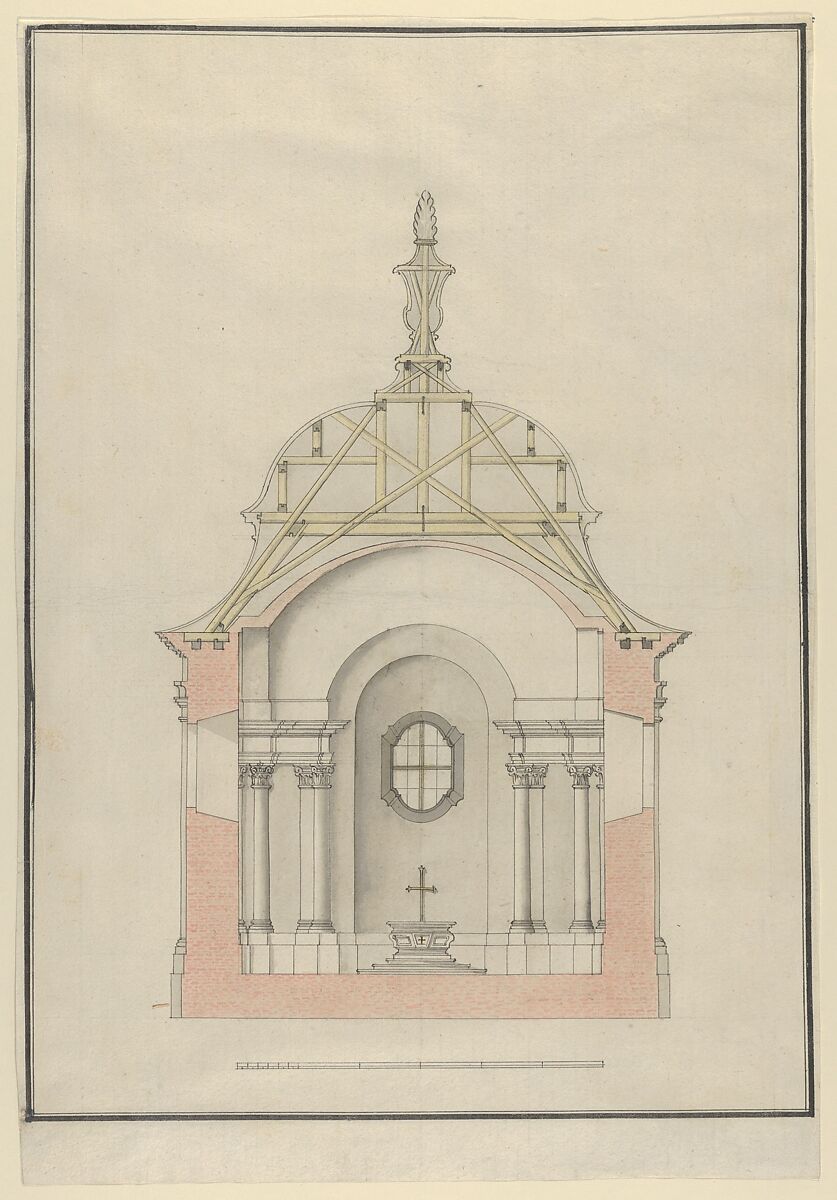 Cross section of a Baroque church or chapel, showing details of the constructrion. The cross section of the walls reveils dense brick work and the cross section of the bell-shaped roof shows the wooden support structure, which reaches all the way into the vase that crowns the building. The interior of the building is characterized by a simple altar with a crucifix, flanked by columns in the Composite order on either side. Below the cross section, a scale has been added.