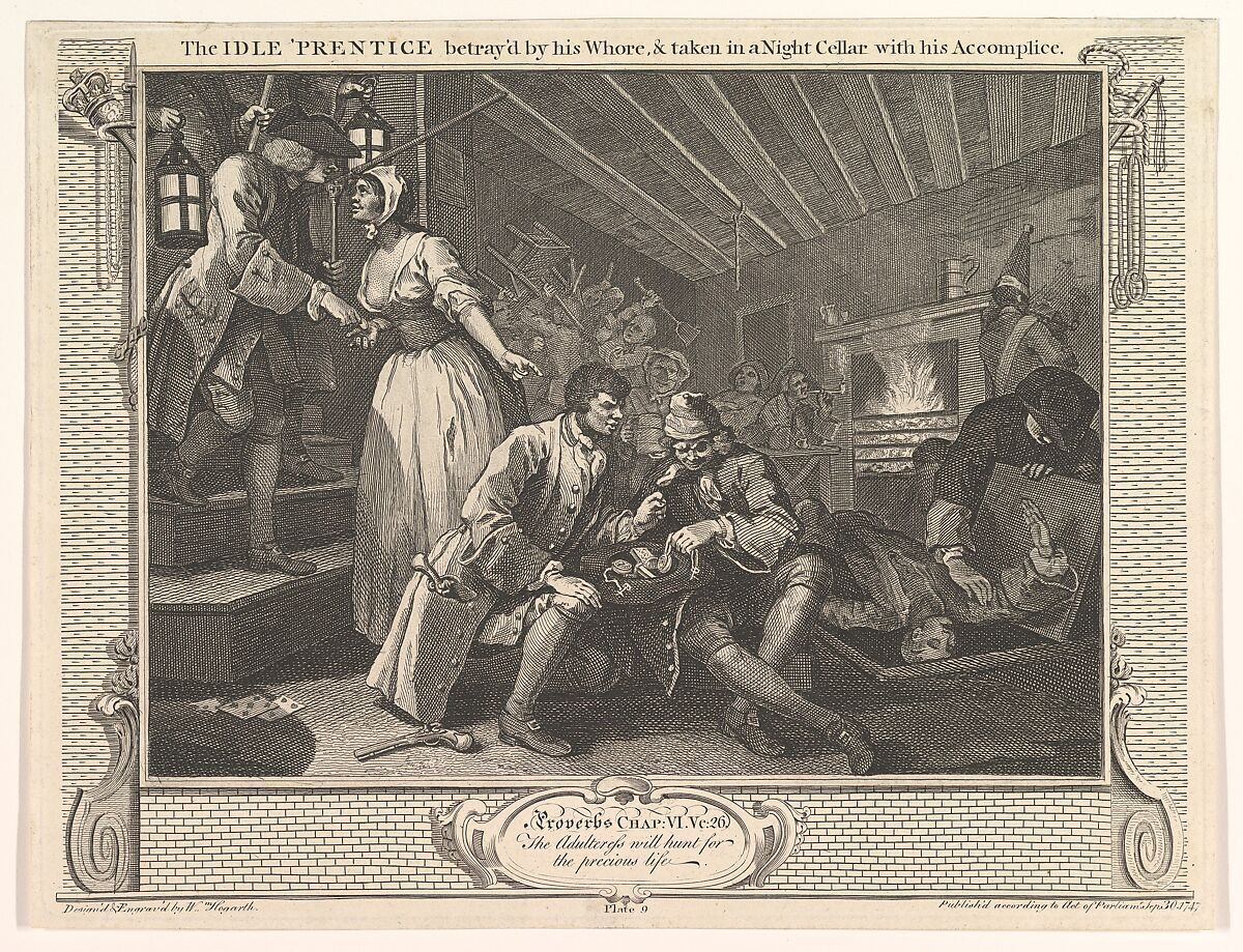 - Title: The Idle 'Prentice Betrayed by his Whore and Taken in a Night Cellar with his Accomplice (Industry and Idleness, plate 9)